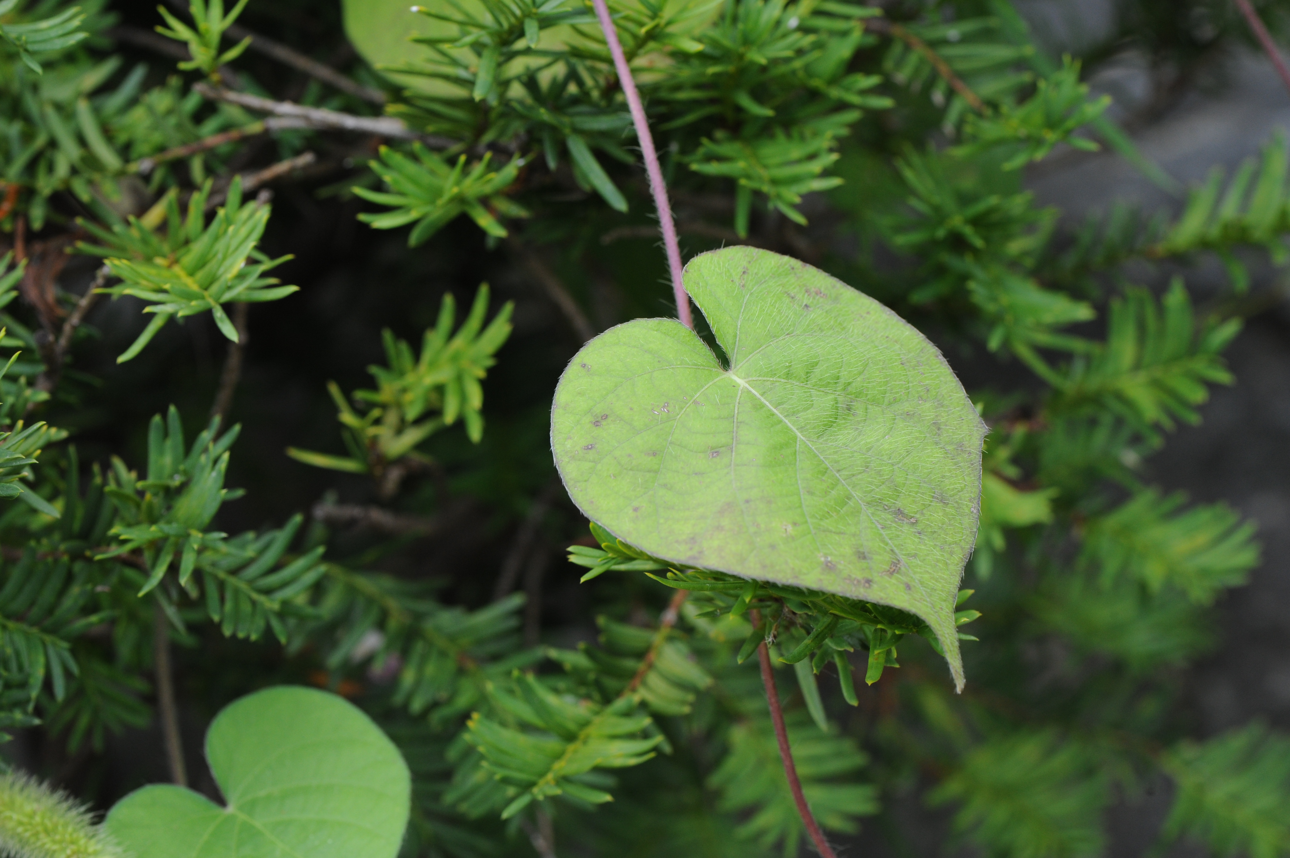 잎은 어긋나며, 넓은 난형으로 길이 6~10cm, 폭 5~8cm, 끝은 뾰족하고 밑부분은 심장형이며, 가장자리는 밋밋하다.