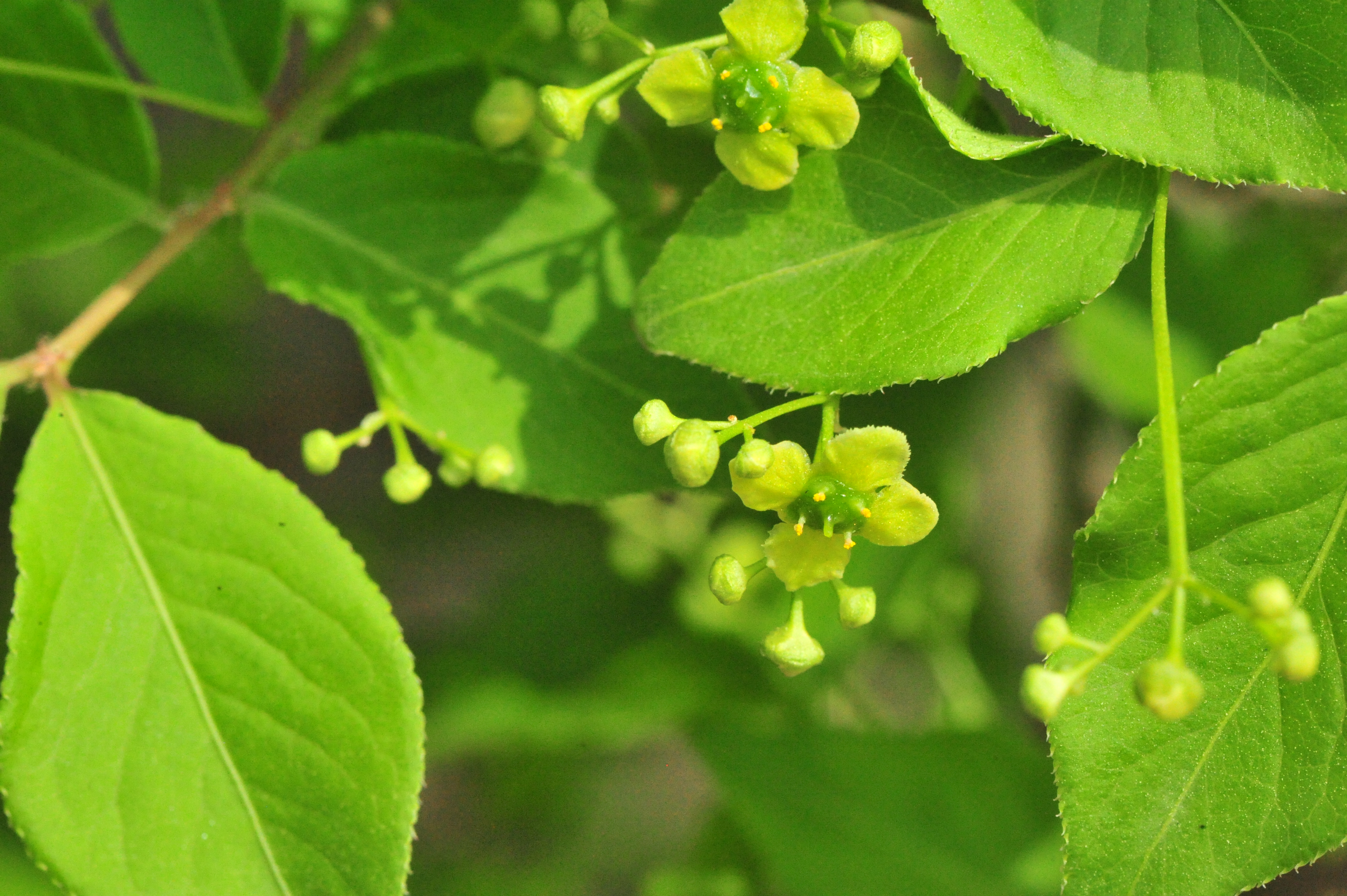 꽃은 5월에 황록색(노란빛을 띤 녹색)의 작은 꽃이 핀다. 개화는 취산꽃차례로 잎겨드랑이에서 나오고 꽃 지름이 10mm로 황록색이며 보통 3개씩 달린다. 꽃잎과 꽃받침잎, 수술은 각각 4개이다. 1~2실의 씨방이 있고, 씨방이 2실인 것은 밑부분만이 붙어있다.