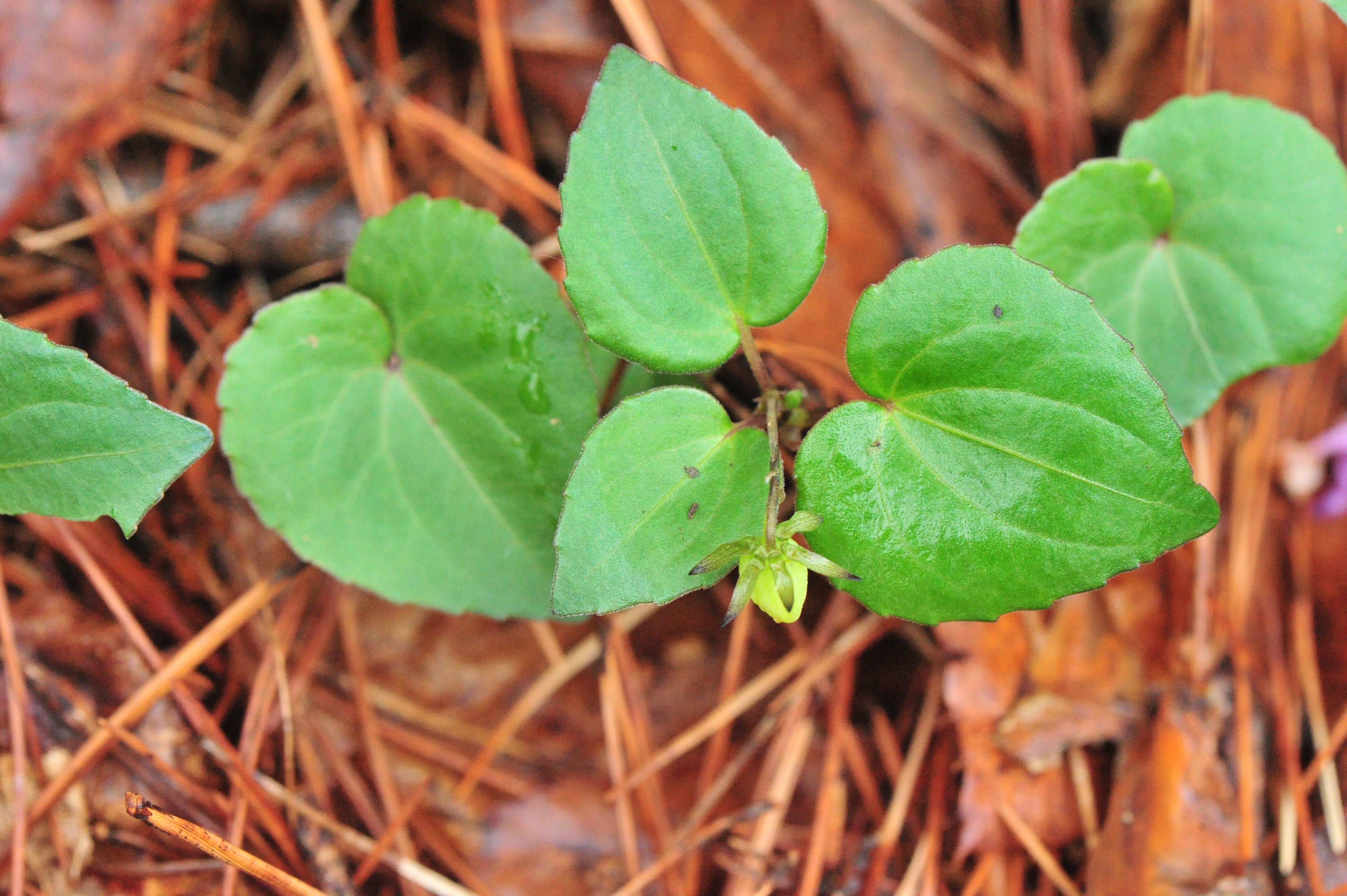 잎은 2∼3장으로 심장 모양이고 길이와 나비가 각각 2.5∼4cm이며 가장자리에 물결 모양의 톱니가 있다. 잎자루는 잎보다 3∼5배 길고 붉은빛을 띤 갈색이다. 줄기에 달린 잎은 잎자루가 없고 마주나며, 앞면은 윤이 난다. 턱잎은 넓은 달걀 모양이고 길이 2∼3mm로 가장자리가 밋밋하다.