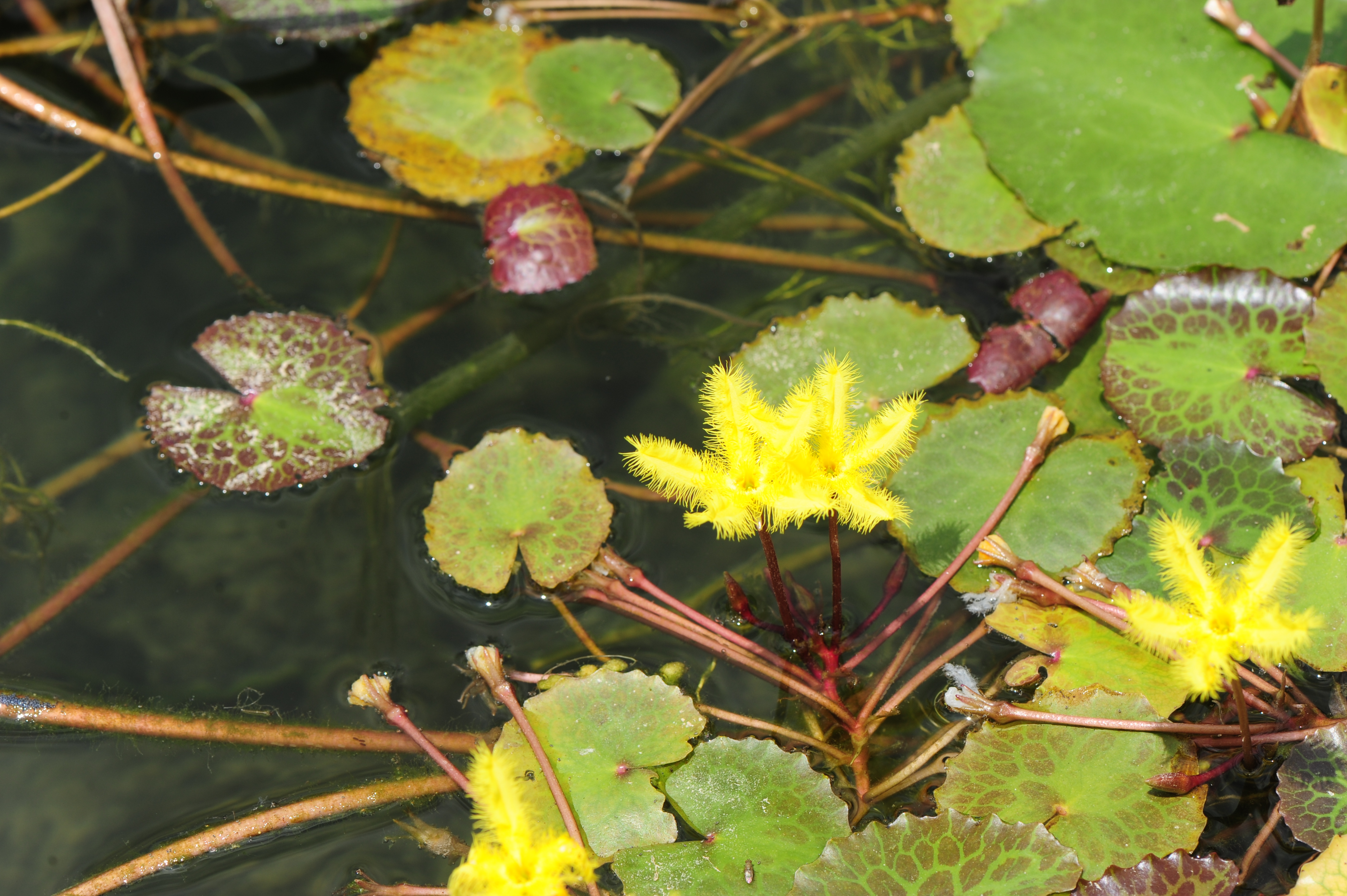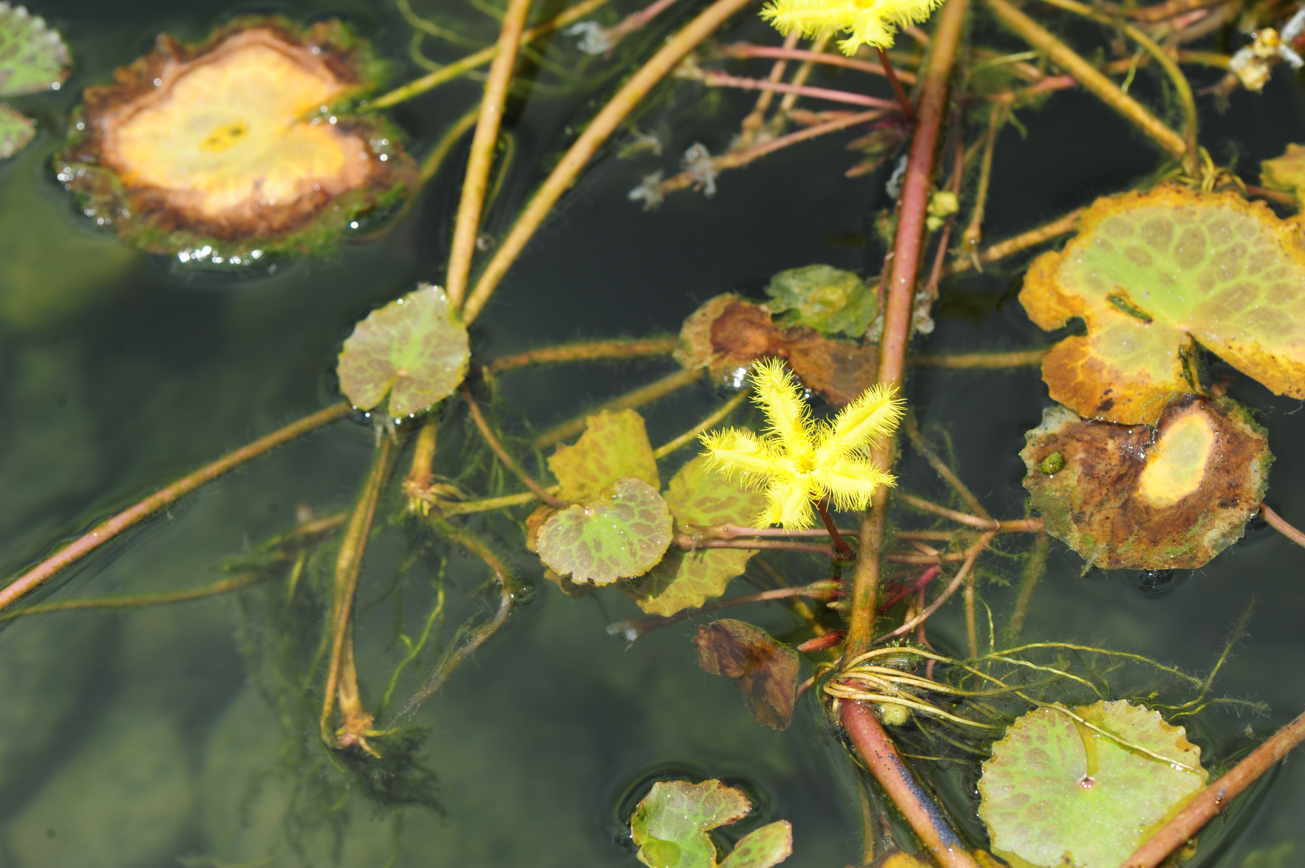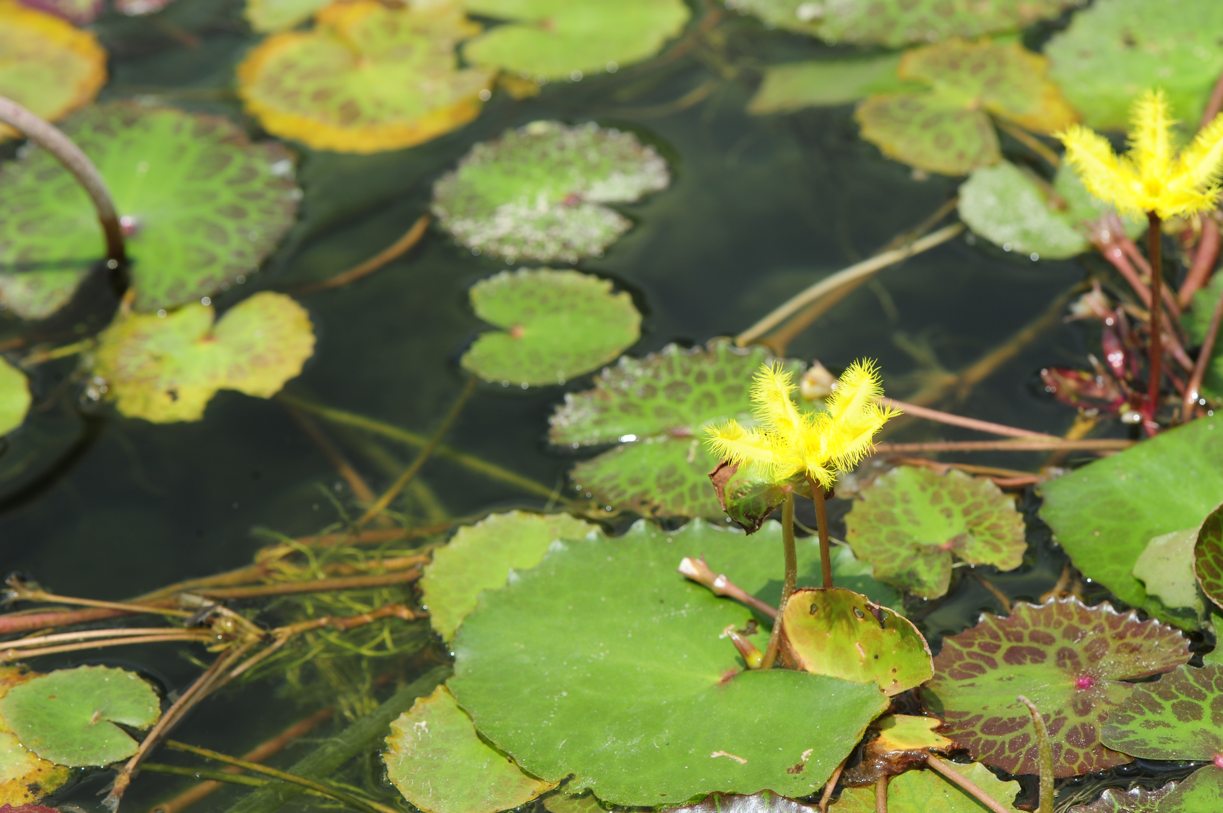 * 잎에 얼룩 반점이 많고 꽃부리 가장자리에 긴털이 도드라지게 길군요. 노랑어리연이 아닌 다른 종일까? 노랑어리연꽃으로 올린다.