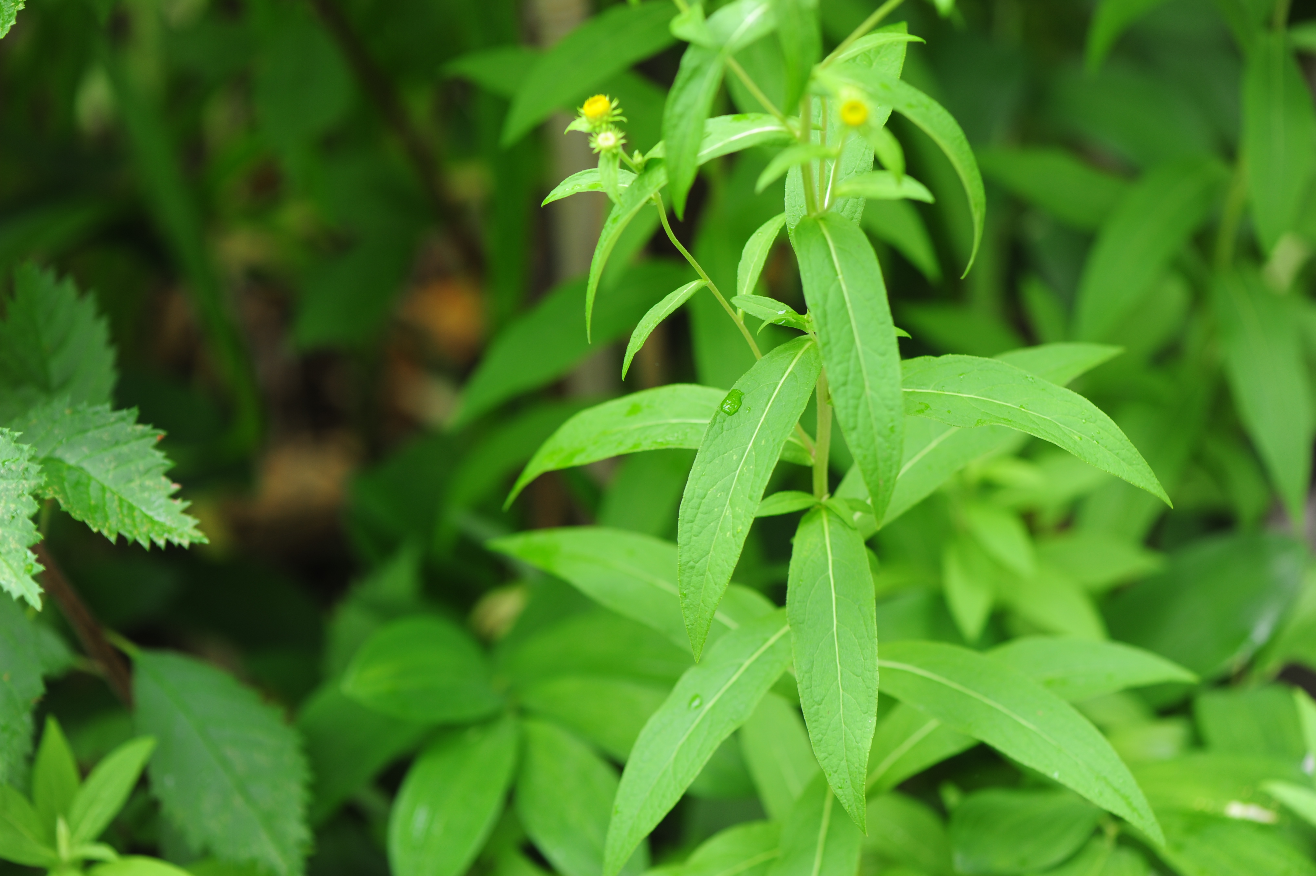 잎은 어긋나고 잎자루는 없으며, 긴 타원형 또는 바소꼴로 잔 톱니가 있다. 잎 길이 5∼10cm, 나비 1∼3cm로 밑부분이 좁아져서 줄기를 싸며 양면에 털이 있다.