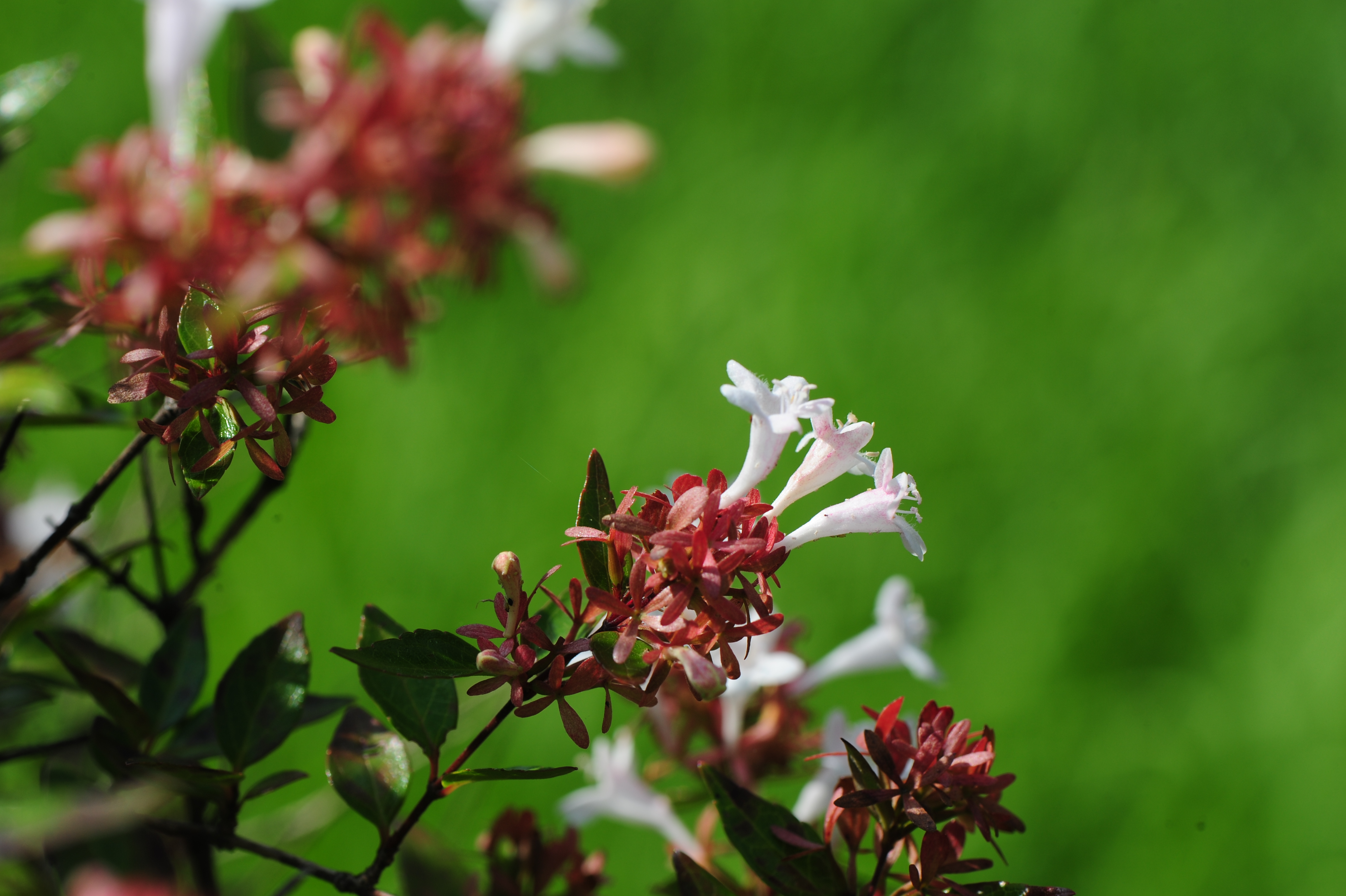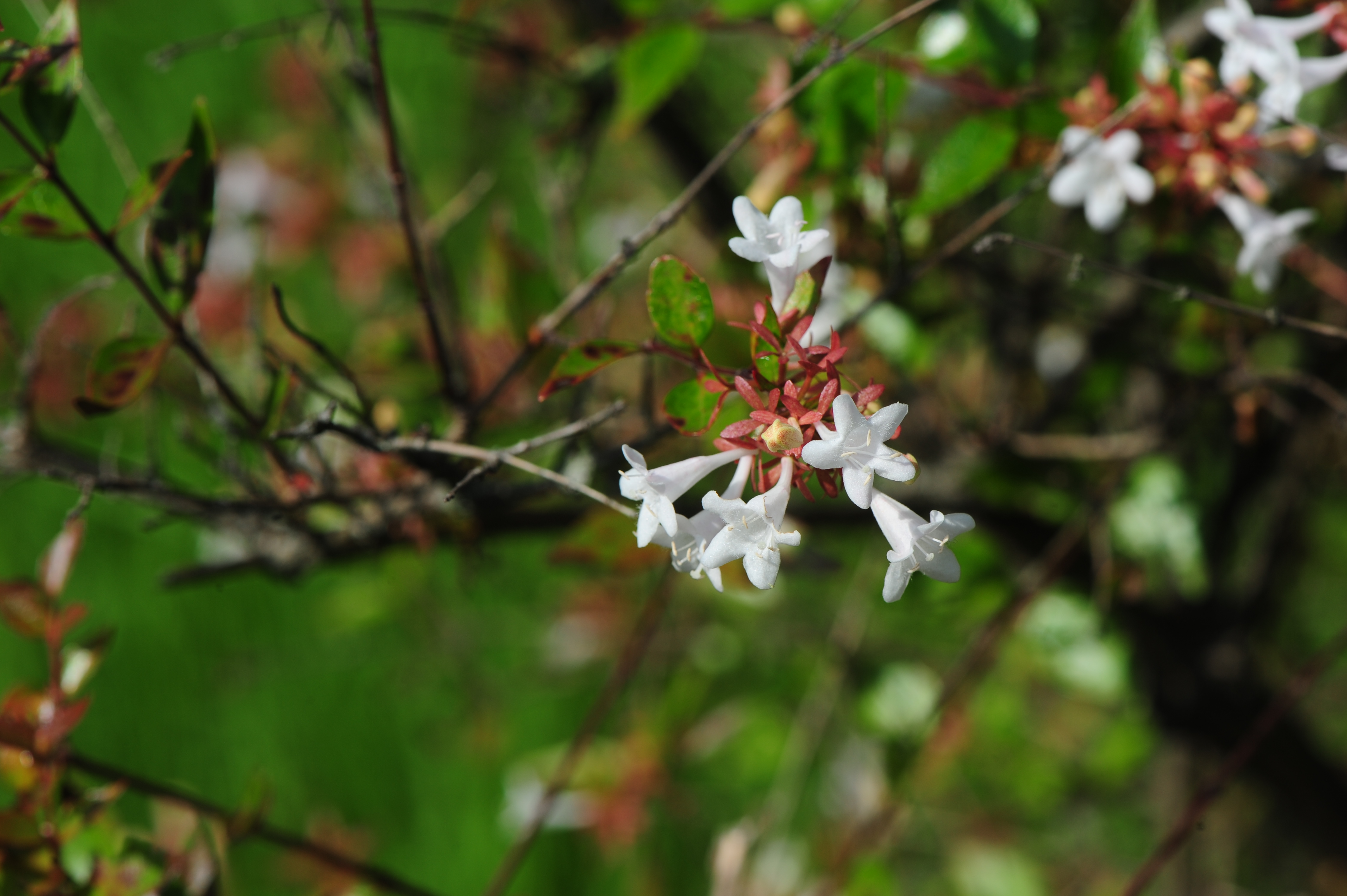 ° 주걱댕강나무 - 꽃받침이 5개, 암 수술이 꽃잎 밖으로 나오지 않는다. 꽃잎 속이 주황색.