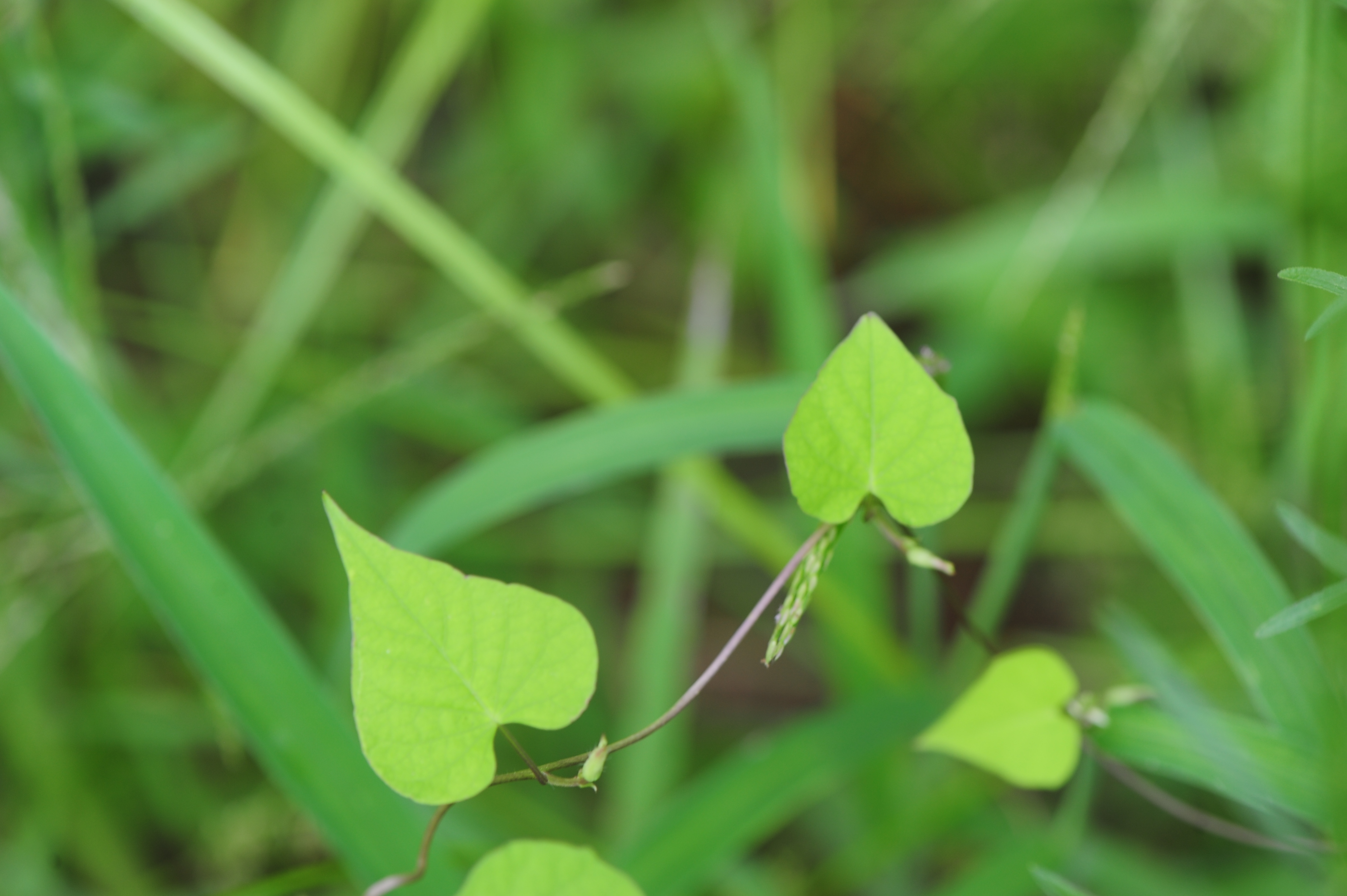 잎은 끝이 뾰족한 넓은 달걀모양 또는 심장모양으로 가장자리가 밋밋하고 가는 잎자루가 있다.